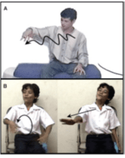 According to the authors, “children analyzed complex events into basic elements and sequenced these elements into hierarchically structured expressions according to principles not observed in gestures accompanying speech in the surrounding language”. This, they argue, is exactly what one would expect from a true language. To test this hypothesis, they asked signers and non-signers to relate events depicted by an animated cartoon to another member of the group, to see what type of hand movements were used to express motion events like “rolling down a hill”. Non-signers accompanied their verbal description with holistic hand movements, termed “gestures” by the authors, to distinguish them from the “signs” used by deaf participants. By “holistic” is meant a single gesture including a rolling movement and a descending movement (A). These were used by all the non-signers and by several of the older signers. Discrete linear movements – a rolling gesture followed by a descending gesture (B) – were used by all the youngest signers but by none of the non-signers.