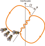 « Dans ce dernier cas, l’abeille court en ligne droite sur une certaine distance, décrit un demi-cercle pour retourner à son point de départ, court de nouveau en ligne droite, décrit un demi-cercle de l’autre côté et cela peut continuer du même endroit pendant plusieurs minutes. Ce qui distingue surtout cette danse de la ronde, ce sont de rapides oscillations de la pointe de l’abdomen, et elles sont toujours exécutées pendant le trajet en ligne droite (appelé pour cela trajet frétillant). » (op cit)