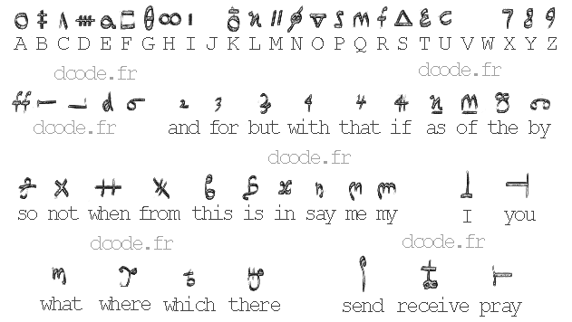 La difficulté était accrue par le fait que le trio ne savait pas dans quelle langue étaient écrites les quelques 50 lettres dont ils disposaient. Après avoir essayé l’italien, le latin et l’espagnol, ils se sont souvenus que Mary avait passé son enfance en France et ils ont essayé le français. Bingo ! Ils ont fait mouliner le logiciel et sont tombés sur quelques mots qui revenaient régulièrement, notamment fils et ma liberté. Chaque fois qu’ils trouvaient un mot compréhensible, ils en faisaient un mot clé et continuaient leurs recherches. Mais plusieurs mois de travail ne révélaient rien d’intéressant. Alors ils ont compris que, contrairement à beaucoup de codes de ce type, les symboles du code ne correspondaient pas toujours à des lettres de l’alphabet, mais pouvaient aussi renvoyer à des mots, voire à des suites de mots. Voici les correspondances entre les signes du code et des lettres ou des mots anglais.